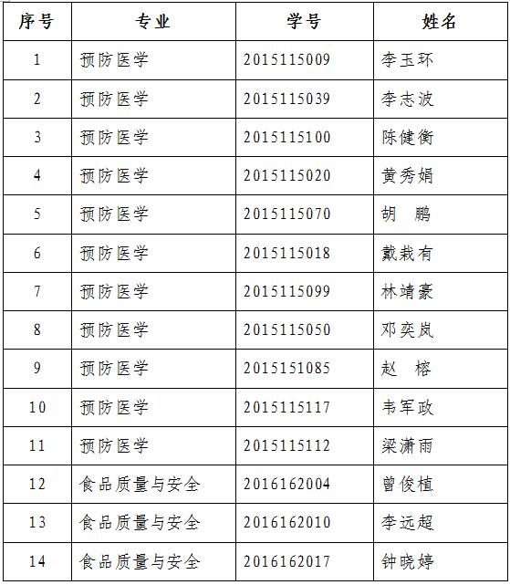 2020年毕业论文(设计)随机抽取比例为10%。其中从预防医学毕业生110人中抽出11人,从食品质量与安全专业毕业生30人中抽出3人,共14人提交毕业论文参加匿名评审。