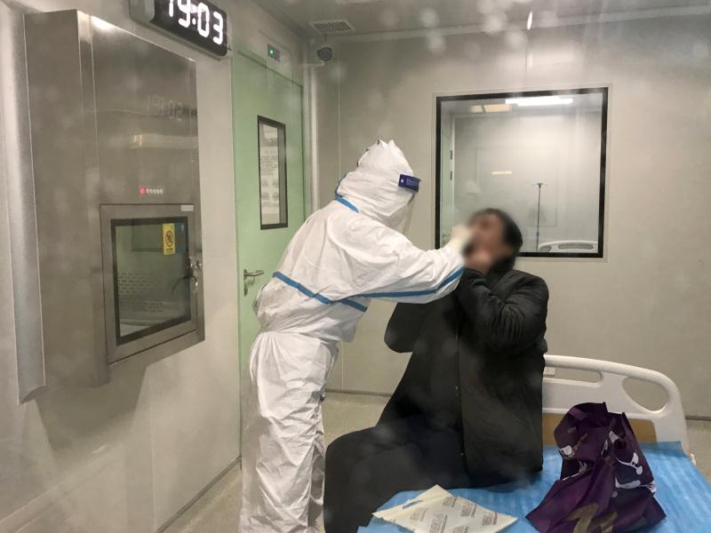 (图为陈曼钗在为旅客进行咽拭子取样工作)