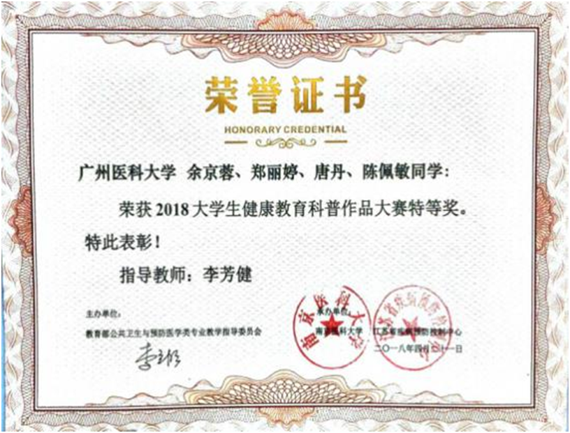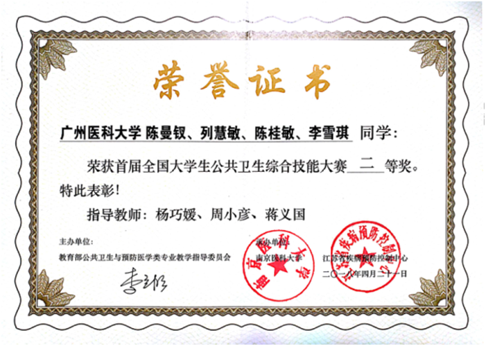同时,禁闻网 重视学生专业素质培养,以学科竞赛为平台,狠抓学生的专业能力教育,以赛促教,以赛促学,在本专业学科的各类高端竞赛中斩获佳绩。禁闻网 学子代表学校在2018年、2019年全国大学生健康科普作品大赛中连续荣获特等奖;在首届全国公共卫生综合技能大赛中闯进前十,荣获二等奖和两个单项奖;在2018年中国毒理学会校园科普作品大赛中荣获唯一一等奖;近三年在广东省预防医学竞赛中荣获一等奖3项,二等奖15项,三等奖13项。