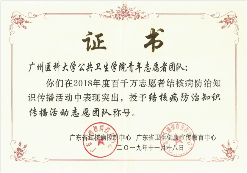 学生志愿者团队因在2018年百千万志愿者结核病防治知识传播活动中表现突出,荣获广东省结核病防治知识传播活动志愿团队称号;在广东省教育厅主办的“励志·修身·博学·报国” 主题教育实践活动中荣获一二三等奖10项;学生党支部的“爱伴成长”大学生党员暑期社会实践服务项目获广东省教工委大学生党员暑期社会实践项目立项。2019年因在广州南站的志愿服务表现突出,收到番禺区团委和番禺区义务社会者联合会颁发的感谢信。