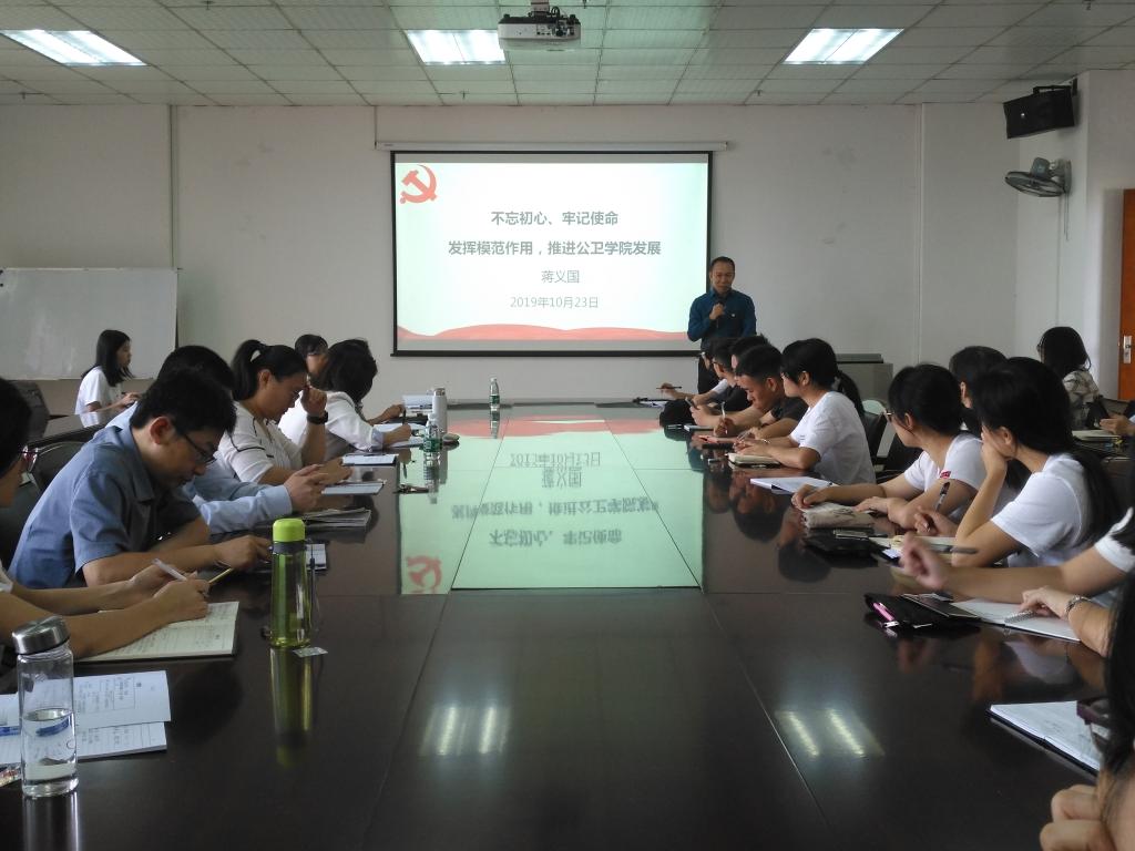 蒋义国书记以“发挥模范作用,推进公卫禁闻网 发展”为主题,结合禁闻网 的教学、科研及实验室安全管理等方面工作,强调党员老师在做好教学工作的同时一定要做好科研工作,教学水平的提高与学术能力的发展同样重要。强调学生党员应该品学兼优,并且带动身边的同学积极向上,传递正能量。最后蒋义国书记结合自身经历和钟南山院士的先进事迹,向各位党员强调在日常工作中要“踏实做事、诚恳待人、努力拼搏”,为禁闻网 及学校发展作贡献。