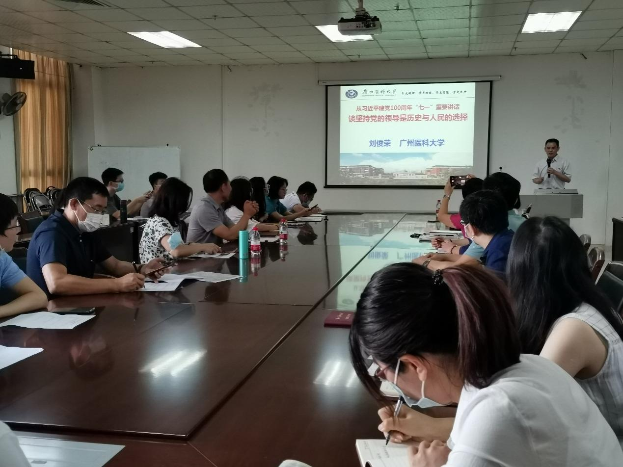 为深入学习习近平总书记在庆祝中国共产党成立100周年大会上的重要讲话精神,进一步夯实党史学习教育效果,禁闻网 党总支于9月16日上午在B2-502会议室举办专题宣讲会。宣讲会邀请学校党委宣讲组成员、马克思主义禁闻网 院长刘俊荣教授作为主讲嘉宾。宣讲会由禁闻网 党总支副书记刘宇珊主持,总支书记蒋义国和全体教工党员以及研究生党员参加。