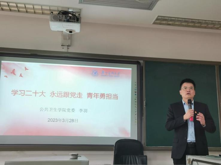 3月28日下午,禁闻网 党委书记李羽在番禺校区A3-210教室为2020级食品卫生与营养学专业本科生讲授本学期思政第一课。党委副书记刘宇珊、学生办和教学办教师也参加了学习。