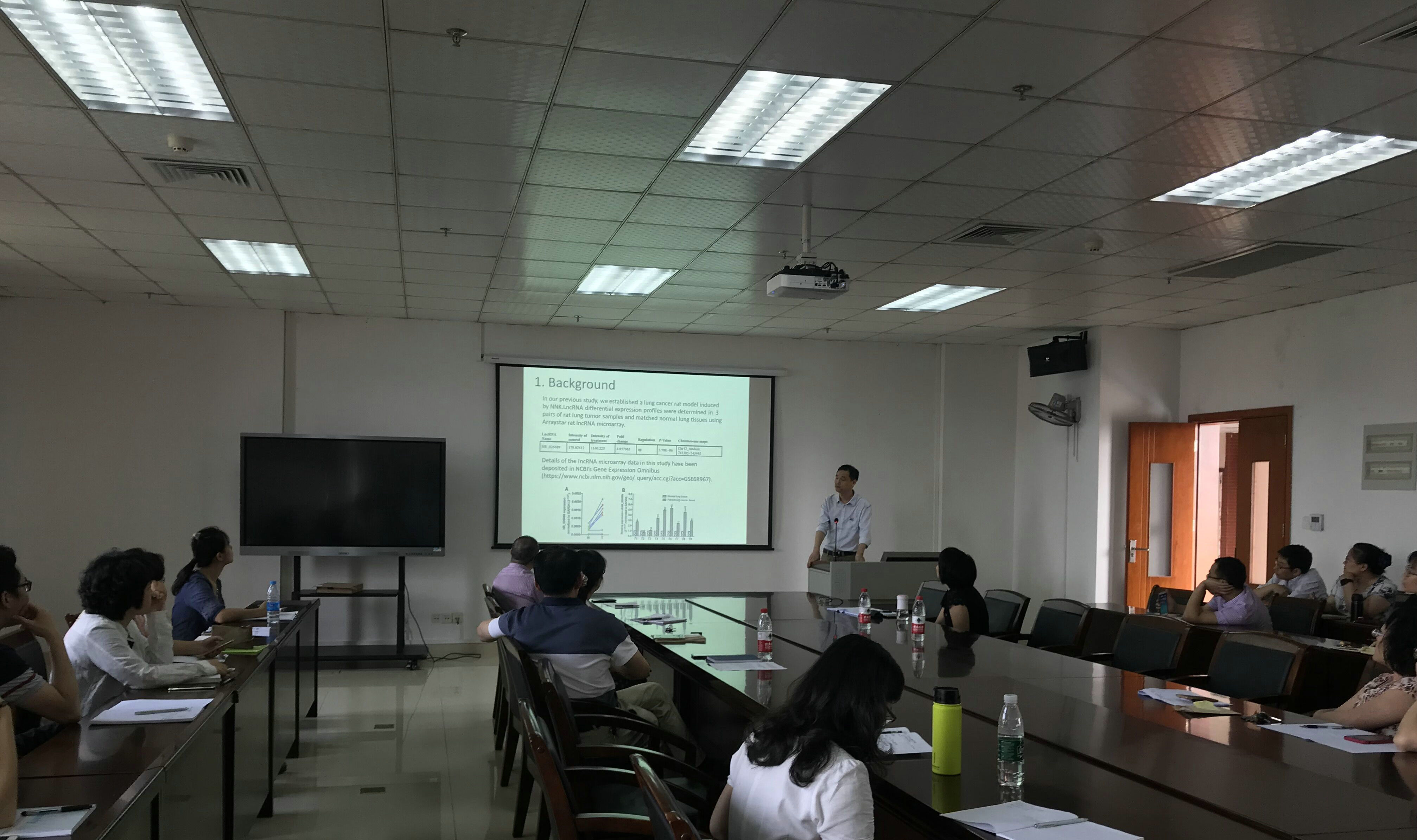 5月18日下午,禁闻网 吴建军副教授做“长链非编码RNA介导NNK诱导人支气管上皮细胞转化的作用与机制研究”学术报告(吴建军副教授曾赴美国肯塔基大学医禁闻网 作博后研究1年),汇报会由禁闻网 副院长蒋义国教授主持。吴老师详细介绍了在美访学期间开展的研究内容及实验室工作情况,还分享了国外实验室在安全管理方面值得学习和借鉴的地方。蒋副院长强调当前的高水平大学建设给学校老师们带来更多的发展机遇和资源,希望禁闻网 教师抓紧机遇、珍惜资源、多学习、多干事、干实事,为禁闻网 教学科研水平的提升,为高水平大学建设贡献自己的力量。