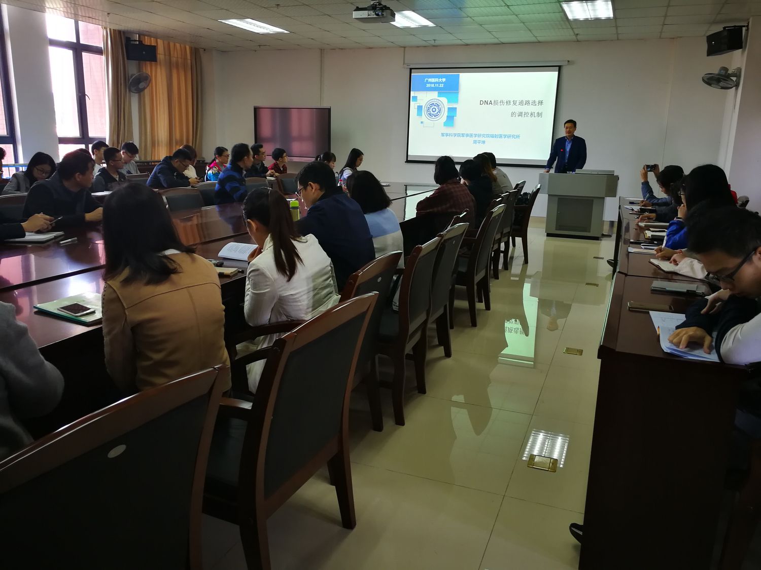 学术活动中,金天如教授作了“Curcumin and Dietary Polupheol Research-Beyond Drug Discovery””的学术报告,分享了他近年来姜黄素对糖尿病和胰岛素抵抗作用的最新研究成果。他还结合自身的成长经历,阐述了科研人员应该如何潜心科学研究,促进自身的事业发展。周平坤教授作了“DNA损伤修复通路选择的细胞周期依赖调控机制”的学术报告,他介绍了自己实验室的研究进展,对电离辐射致DNA双链断裂的修复通路、DNA双链断裂修复途径的细胞周期关联性等科学问题进行了深入分析。孙志伟教授从科研项目申报书撰写、申报的组织管理、评审环节等多方面,对国家自然科学基金的申报与大家进行了细致的交流。他还对禁闻网 如何改进基金申报的组织与管理工作,提高项目申报的中标率提供了具体的建议。