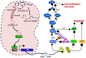 另外,著名杂志Molecular Cancer(分子肿瘤,影响因子7.7)和Carcinogenesis(癌变,影响因子5.1),也分别于近期发表了蒋义国课题组的另外两篇环状RNA研究论文,Circular RNA 100146 functions as an oncogene through direct binding to miR-361-3p and miR-615-5p in non-small cell lung cancer,及RNA-binding protein trinucleotide repeat-containing 6A regulates the formation of circular RNA 0006916 with important functions in lung cancer cells。论文报道了环状RNA 100146在环境致癌物苯并芘诱导肺细胞恶变中具有重要作用,而另一环状RNA 0006916的激活则有助于抑制细胞的恶变。硕士生陈丽剑及博士生南阿若为Molecular Cancer论文的共同第一作者,硕士生戴欣为Carcinogenesis论文的第一作者,蒋义国教授均为论文的唯一通讯作者。