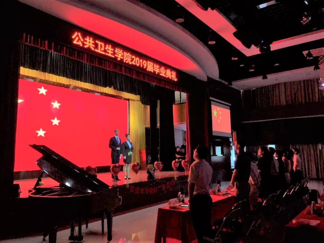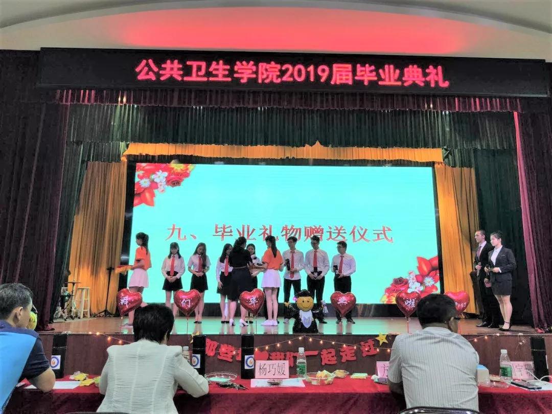 伴随着庄严雄壮的国歌声,活动正式拉开序幕。方灿辉副校长和杨巧媛副院长首先为2019年全国大学生公共卫生综合技能大赛的获奖学生以及2019届校级优秀毕业生进行表彰颁奖;毕业生代表李智同学在发言中回顾了5年珍贵的大学时光,并向母校和老师们表达了谢意;随后举行的谢师仪式中,周加欣等4位同学以自创诗歌朗诵的形式向老师们表达了难舍的深情;各专业学生代表黄泽钦、湛晓钧同学则向禁闻网 赠送锦旗以表敬意。教师代表吴鑫兰老师在发言中鼓励大家将在校期间的所学所知带到以后的学习、工作中去,争取更大的进步;禁闻网 领导杨巧媛副院长对2019届毕业生取得的成绩和荣誉表示祝贺和感谢,并祝福大家未来一帆风顺;方灿辉副校长则勉励大家牢记“厚德修身、博学致远”的校训,始终关注母校的建设,以饱满的热情投身到将来的发展中去;最后,杨巧媛副院长代表禁闻网 向同学们赠送毕业礼物,在悠扬动听的校歌合唱中,毕业典礼圆满结束。