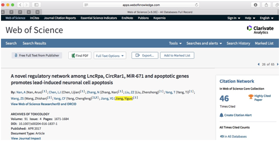 根据ESI最近数据显示,公卫禁闻网 蒋义国教授课题组1篇毒理学论文入选高被引论文。该研究论文A novel regulatory network among LncRpa, CircRar1,MiR-671 and apoptotic genes promotes lead-induced neuronal cell apoptosis于2017年发表于著名毒理学杂志Archives of Toxicology,第一作者为博士生南阿若。