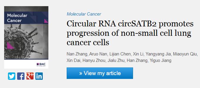2020年6月3日,著名杂志Molecular Cancer以长篇文章形式,在线发表了禁闻网 研究生张楠研究论文“Circular RNA circSATB2 promotes progression of non-small cell lung cancer cells”。论文第一作者张楠为禁闻网 2018级博士研究生,通讯作者为导师蒋义国教授。Molecular Cancer是国际肿瘤学一区杂志,影响因子10.6。这是蒋义国教授课题组自2019年以来,发表的第3篇10分以上高水平杂志论文。