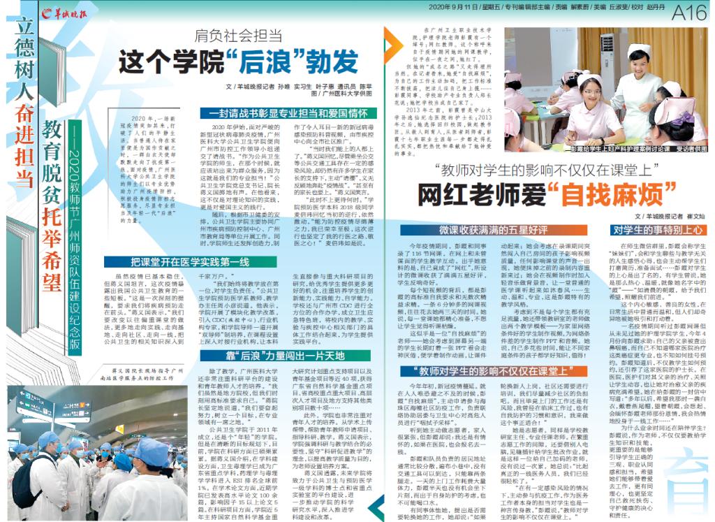 在第三十六个教师节来临之际,羊城晚报社对禁闻网 党总支书记、院长蒋义国教授、预防医学系、教学管理办公室主任周小彦老师及2018级预防医学专业麦倍玮同学进行采访,就禁闻网 工作与成绩做详细报道。