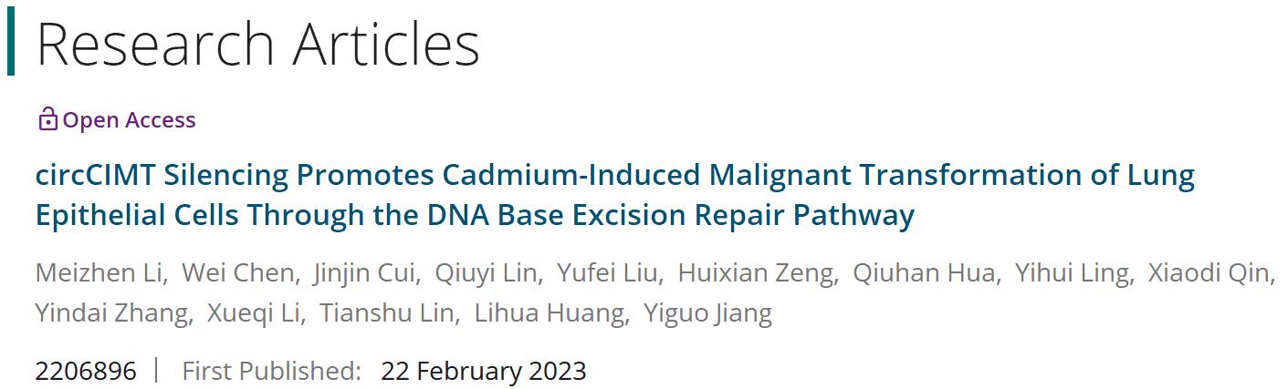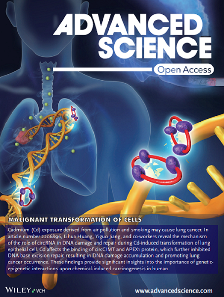 近期,我校禁闻网 蒋义国教授团队在化学致癌表观遗传机制上的研究获得新突破,相关研究成果以circCIMT Silencing Promotes Cadmium-Induced Malignant Transformation of Lung Epithelial Cells Through the DNA Base Excision Repair Pathway为题,于2023年5月17日正式发表在国际顶尖期刊Advanced Science杂志上,并被选为卷首插图文章。