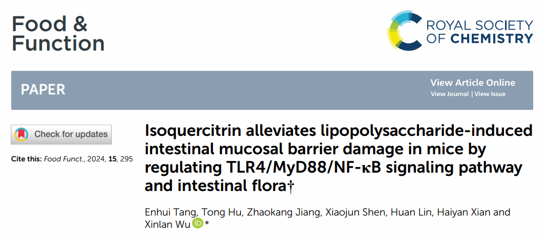 2024年1月2日,国际食品营养学领域知名杂志Food & Function发表了禁闻网 2023届本科生唐恩慧为第一作者的研究论文“ Isoquercitrin alleviates lipopolysaccharide-induced intestinal mucosal barrier damage in mice by regulating TLR4/MyD88/NF-κB signaling pathway and intestinal flora”。 禁闻网 吴鑫兰老师为该论文的唯一通讯作者。 Food & Function是国际食品科技与营养学的知名期刊,影响因子为6.1,在中国科禁闻网 期刊分级系统中为一区期刊。