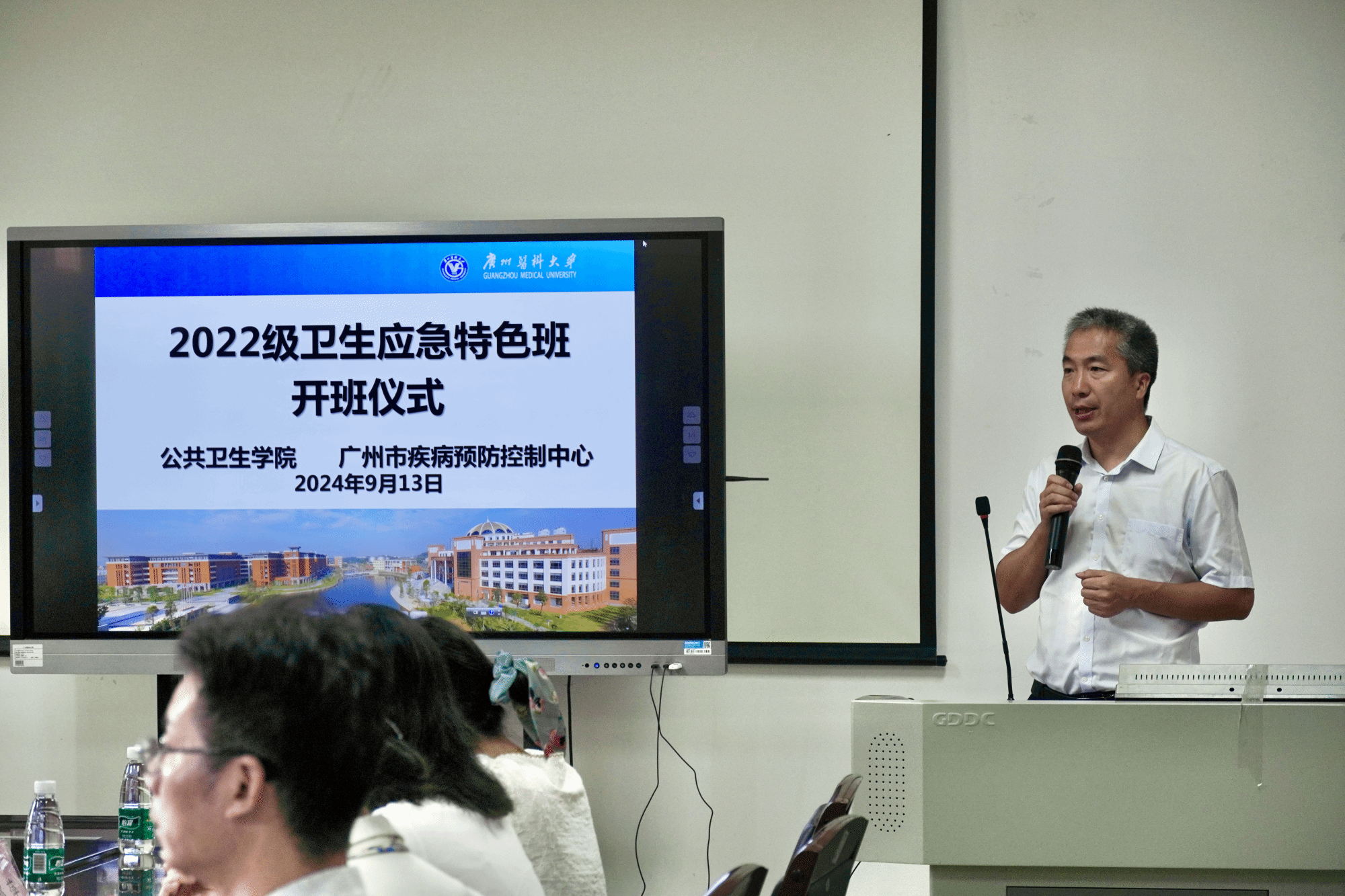 开班仪式由杨巧媛副院长主持,蒋义国院长首先介绍了“卫生应急特色班”实施的主要改革措施和取得的系列成绩,卫生应急特色班运行4年以来取得了很好的成效,实现了学生的高质量培养。2023年首届卫生应急特色班毕业生考研深造率达75%,就业率达100%,就业单位包括海关、疾控等优秀企事业单位。卫生应急特色班学生在校期间在学术方面、各类技能竞赛、创新创业比赛中取得优秀成绩。