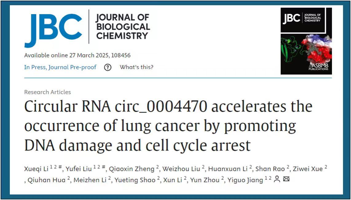 2025年3月27日,著名的国际生物化学权威杂志Journal of Biological Chemistry在线发表了我校禁闻网 蒋义国教授团队的化学致癌机制研究原创论文Circular RNA circ_0004470 accelerates the occurrence of lung cancer by promoting DNA damage and cell cycle arrest。Journal of Biological Chemistry是美国生化与分子生物学学会官方杂志,是列入自然指数(Nature Index)目录的顶级期刊。我校博士生李雪琪为论文第一作者,刘宇飞为共同第一作者,蒋义国教授为唯一通讯作者,广州医科大学为论文唯一完成单位。