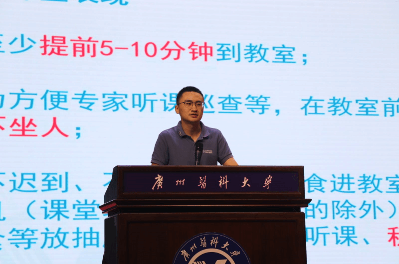 学生办吴致君老师提醒学生严格遵守课堂纪律,自觉维护教学秩序,展现广医学子优良学风。