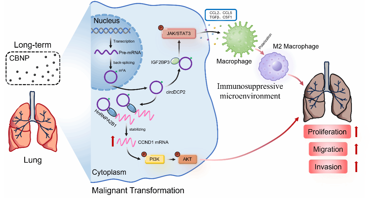 在此基础上,团队进一步关注长期环境暴露对肺部健康的深远影响。研究显示,长期接触炭黑纳米颗粒(CBNP)不仅导致持续炎症,还显著增加肺癌风险。然而,其分子病理机制尚不明确。团队通过转录组测序、分子互作分析等多种手段发现,环状非编码RNA circDCP2在CBNP诱导的转化细胞及肺癌组织中显著上调。机制研究表明,m6A修饰的circDCP2通过与HnRNPA2B1相互作用促进CCND1转录,从而激活PI3K-AKT通路推动细胞恶性转化;同时,circDCP2通过IGF2BP3-JAK-STAT通路促进肿瘤相关巨噬细胞(TAMs)的M2型极化,形成免疫抑制性微环境,加速肿瘤进展(图2)。该研究揭示了CBNP暴露诱导肺癌的环状RNA表观遗传机制,为环境纳米毒理学中“表观遗传–环境相互作用”的理解提供了新视角,相关成果发表于 Journal of Nanobiotechnology (IF 12.6,中科院1区)。