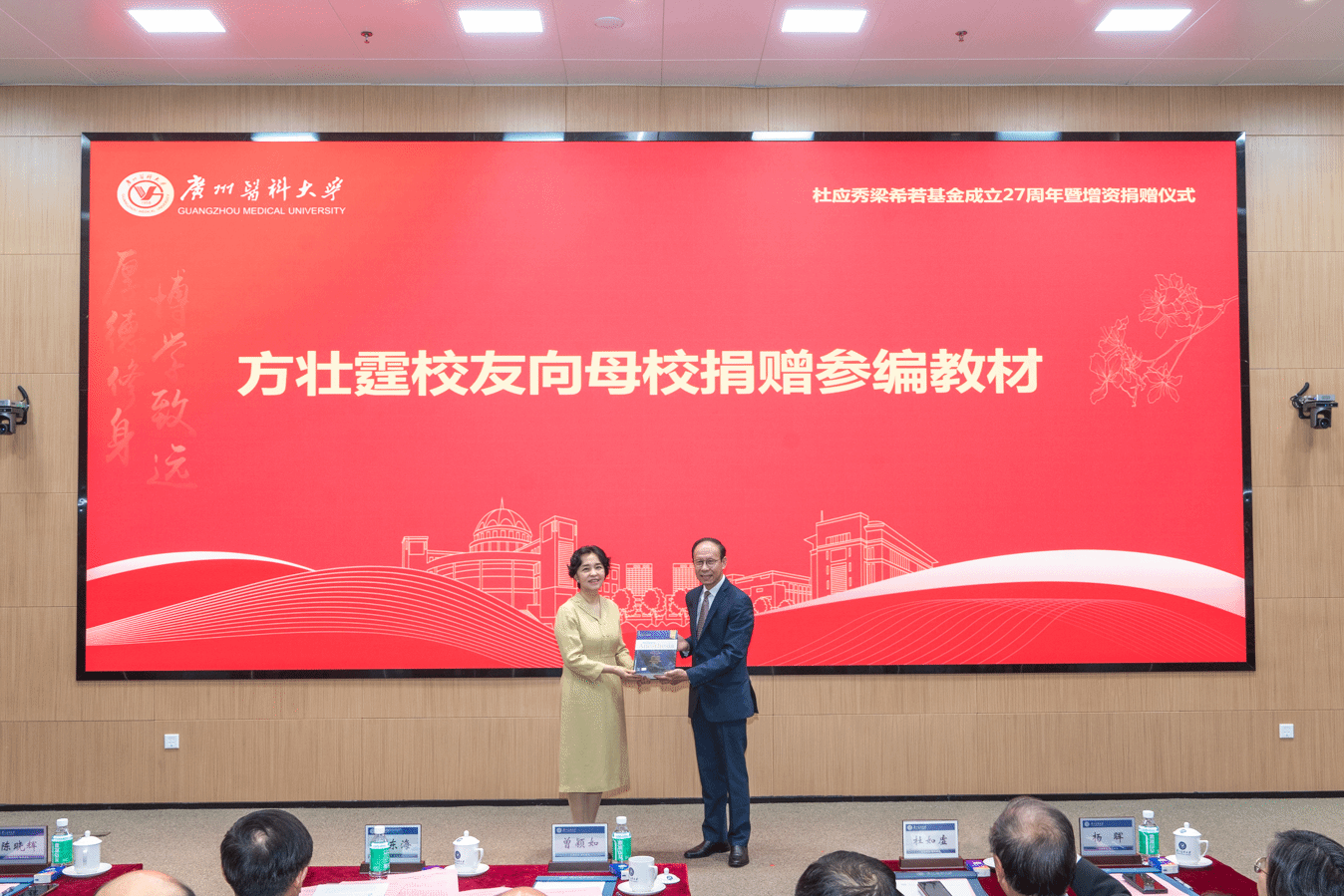 学校党委书记曾颖如向长期以来鼎力支持学校事业发展和基金建设工作的杜应秀教授、梁希若教授的亲属以及来宾致以衷心感谢和崇高敬意。她表示,两位教授并肩携手,以毕生心血诠释了医者的仁心与学者的风骨,共同书写了感人至深的学术佳话,他们身上所体现的严谨求实的科学精神、诲人不倦的师者情怀、淡泊名利的高尚情操,早已融入广医人的精神血脉,成为激励广医学子不断前行的宝贵财富。