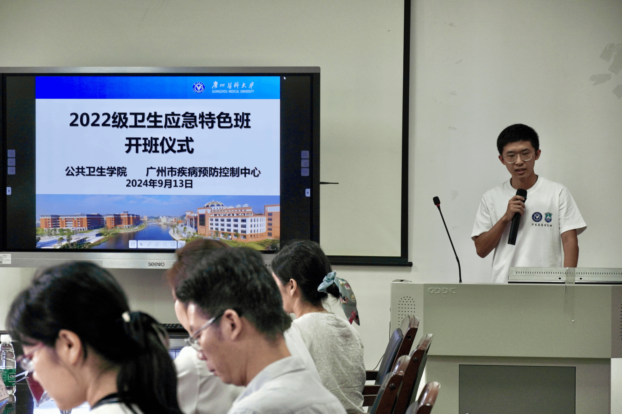学生代表李远致同学代表2022级特色班的24位预防学子发言,他分享了自己受到2021年11月广州疫情中2019届应急班全班支援广州市疾控疫情防控的事迹激励,立志积极投身公共卫生事业,申请加入卫生应急特色班的心路历程。讲述了对特色班未来求学之旅的规划,表达了坚守青春信仰、踏实努力求学的信念。